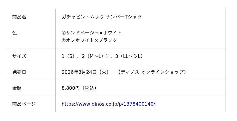 株式会社dinos 株式会社dinos(本社:東京都中野区、代表取締役社長:加藤 浩輔)は、「ガチャピン・ムック みんなともだちの日」(4月2日)を軸とした企画に参画し、人気キャラクター「ガチャピン・ムック」とのコラボレーションアイテムを2026年3月から『ディノス オンラインショップ』で順次発売いたします。