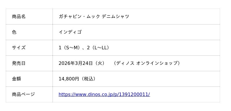 ガチャピン・ムックを黒の線画で描いたデニムアイテム 愛嬌たっぷりのふたりを黒の線画でデッサン風タッチに描いたデニムシャツとバレルデニムパンツです。通年で活躍する薄手のデニムシャツには、胸ポケットにガチャピン・ムックをレイアウトしました。ストレッチデニム素材でゆったりした履き心地のバレルパンツには、ちょっぴりへこんだような、なんともいとおしくてたまらない表情のガチャピンをデザインしました。これらの商品を掲載したファッションカタログ『DAMA collection +PLUS』2026夏号を4月1日(水)に発刊し配布するほか、『ディノス オンラインショップ』では3月から販売いたします。
