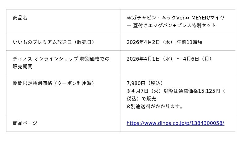 MEYER×dinos55周年×ガチャピン・ムックのコラボエッグパン 米カリフォルニアを拠点とする調理器具ブランドMEYER(マイヤー)社とdinos55周年、ガチャピン・ムックがコラボレーションした玉子焼き用のフライパン「≪ガチャピン・ムックVer≫MEYER/マイヤー 蓋付きエッグパン+プレス特別セット」を企画・開発し、ディノスオンラインショップで販売します。エッグパンはオールステンレスで蓄熱性に優れ、セットのガラス製の蓋を使えば炒め物や少量の煮物、餃子などにも便利。肉や魚に香ばしい焼き目をつけることができるフライパンプレスは、ガチャピン・ムックのイラストをプリントしたdinos限定モデルです。なお、「ガチャピン・ムック みんなともだちの日」を記念して、4月2日(木)放送のフジテレビ番組『ノンストップ!』の通販コーナー『いいものプレミアム』で放映。4月6日(月)まで期間限定特別価格で販売します。