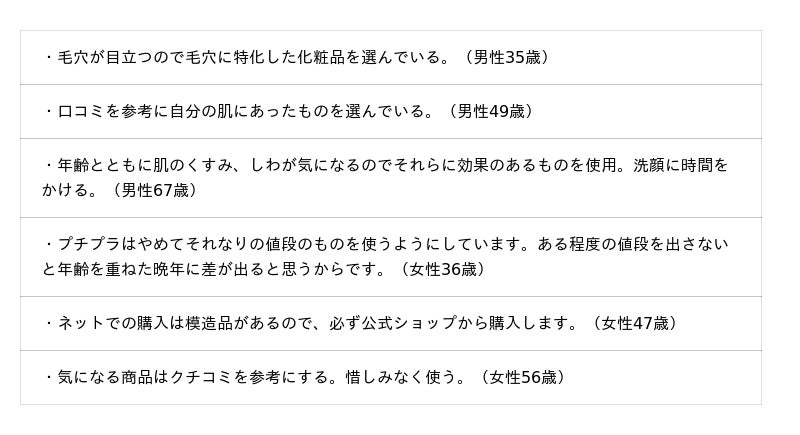 スキンケア用品・化粧品の使用状況や重視点、購入場所などについて聞いています。調査結果をお知らせいたします。