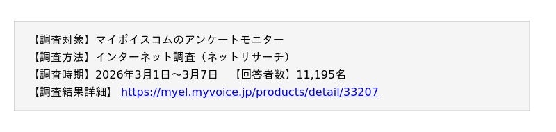 調査結果の掲載・引用に関してこちらは、マイボイスコム(株)がインターネット調査(ネットリサーチ)で実施した自主調査結果です。