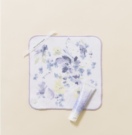 ブルーの花が咲き乱れるロマンティックなパッケージのハンドクリームとハンドタオルでご用意。