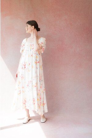 つぼみをイメージしたパフスリーブの袖がフェミニンなフラワー柄マキシワンピース。