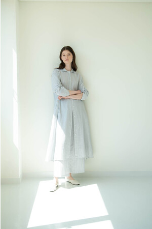 ギャザー入りのネックラインと高めの切り替え位置でスタイルアップも叶います。