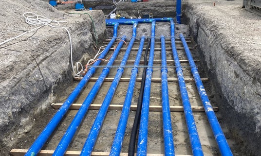 本拠点では、地中熱ヒートポンプを利用した空調システムを導入します。国内の地中熱利用では最大規模となる200本の地中熱交換器を実装し、地下100mより安定した熱エネルギーを取り出します。これを1階部分の冷房および暖房に利用することで、低エネルギーで室温を快適に保ちます。本システムの導入により、従来の空調と比べて約30%のエネルギー消費量削減が見込まれます。これはAmazon全体の物流拠点においても先進的な取り組みです。