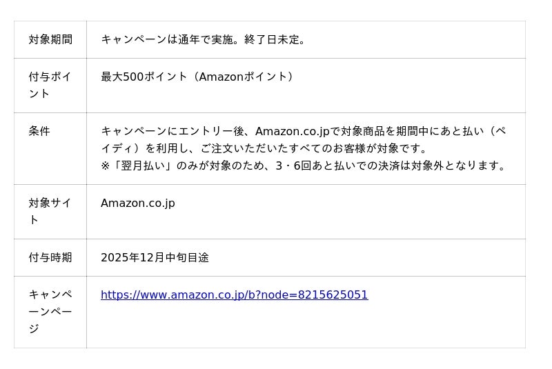 また「プライム感謝祭」とその前後の期間中に、Amazon.co.jpでのお買い物であと払い(ペイディ)、メルペイ、リクルートポイントを利用すると、ポイントが還元されるキャンペーンなどを実施します。