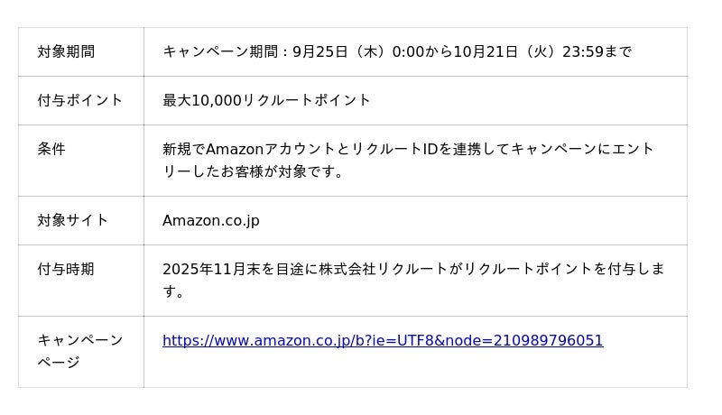 リクルートID とAmazonアカウントの新規連携で、最大10,000リクルートポイントが当たるリクルートポイントは、Amazon.co.jpのパートナーポイントプログラムのひとつで、リクルートのサービス利用でたまるポイントです。お持ちのリクルートポイントを1ポイント=1円として直接「プライム感謝祭」のお買い物に利用いただけます。新たにAmazonアカウントとリクルートIDを連携し、キャンペーンにエントリーしたすべてのお客様を対象に、抽選で最大10,000リクルートポイントが当たります。