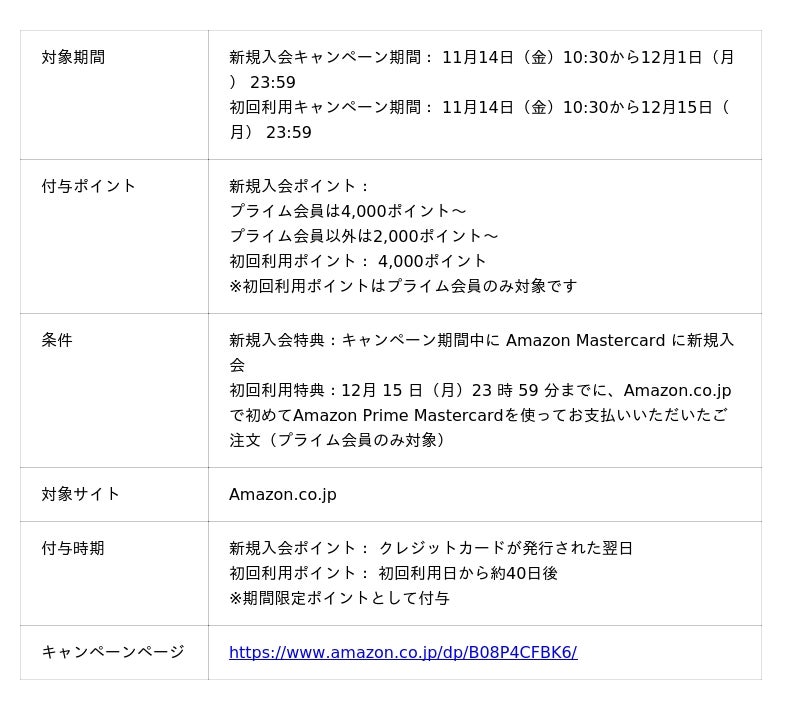 またAmazon Mastercardでは、「Amazon ブラックフライデー」とその前後の期間中に、新規入会と初回利用でポイントが還元されるキャンペーンを実施します。