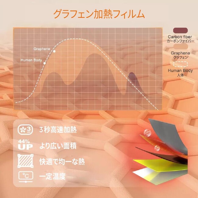 グラフェン発熱フィルム素材使用薄いのに強度が高く、熱伝導性に優れているグラフェン素材を使用しております。