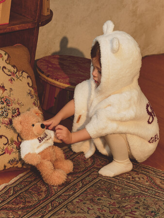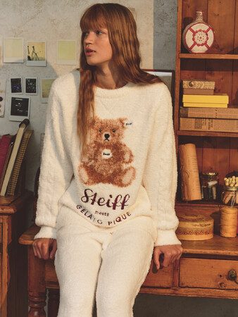 ふんわりとした毛並みのテディベア"エミリア"をデザインしたジャガードプルオーバーとワンピース。さらりとした肌触りの'パウダー'素材で、絵柄の部分には本物のテディベアをイメージした毛足の長い素材を使用しています。シュタイフで愛情を込めて作られた正規商品であることの証になる耳のボタンとタグ「ボタン・イン・イヤー」や、ブランドロゴは刺繍で表現しました。