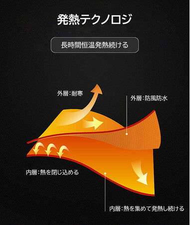 分厚いポリエステルで外からの風を防いで、グラフェン素材によってこもっている熱を上手に循環させることによって、高い防寒性能を誇っています。