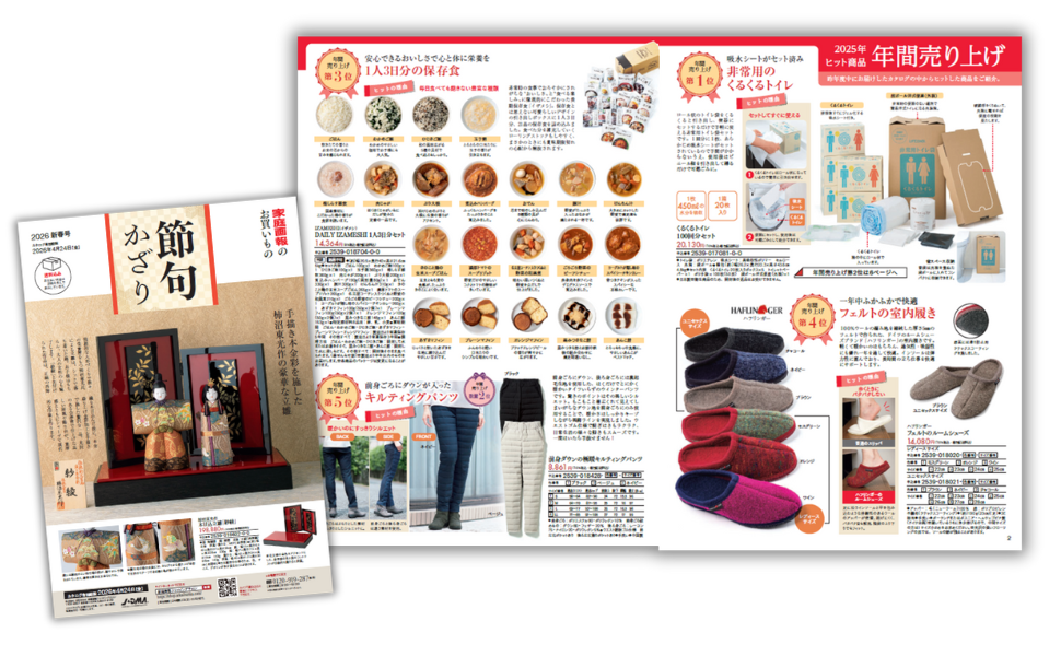 インテリアカタログ『Home』は、「新春ベストセラー」と「節句かざり」の2大特集でお届けします。2025年のヒット&殿堂入り商品を中心に紹介する「新春ベストセラー」には、インテリア・雑貨、災害対策品、美容など、使って納得の価値ある品が勢揃い。両表紙の「節句かざり」では、雛飾りや兜飾りをはじめ、タペストリーやのれんなど、晴れやかに節目を祝う眼福の逸品を集めました。