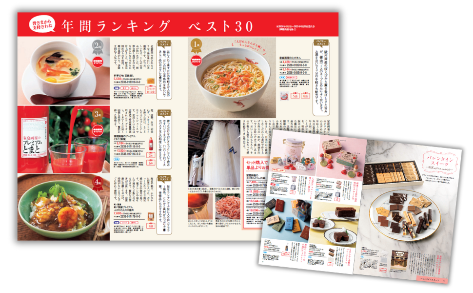 グルメカタログ『美味便り』では、昨年の売り上げランキングベスト30を発表。皆さまから支持された美味の数々を、愛される理由とともにご紹介します。このほか、デザインにときめきを感じおいしさに魅了される「バレンタインスイーツ」、ほっと一息つける時間に欠かせない「新春 幸福おやつ」、こだわりの味をお届けする「彩り楽しむ新春のお弁当」など、充実のランナップです。