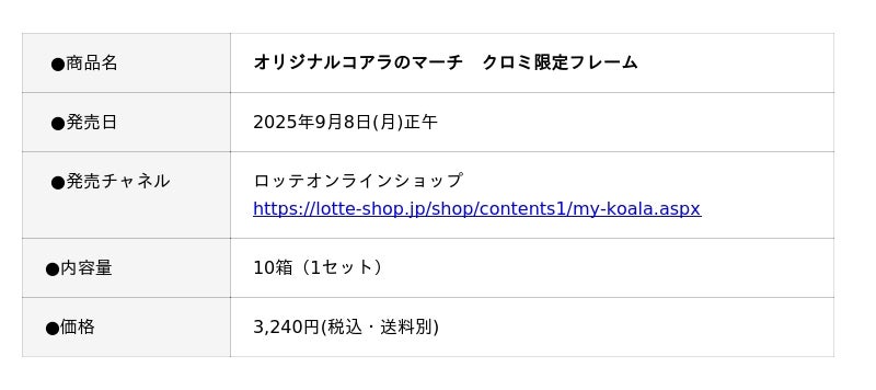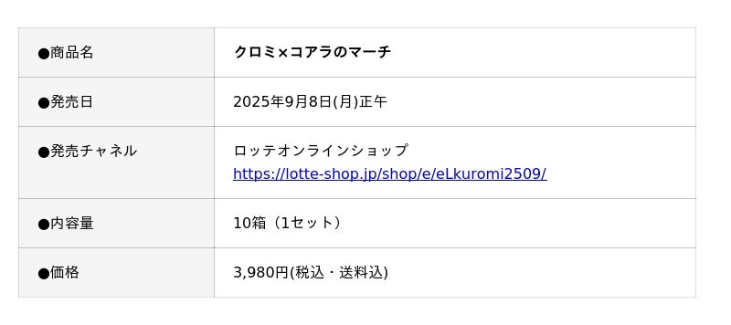 株式会社ロッテ株式会社ロッテは9月8日(月)正午に、ロッテオンラインショップ限定で「オリジナルコアラのマーチ」シリーズから、「クロミ×コアラのマーチ」を販売します。株式会社サンリオのキャラクター「クロミ」が、大人気チョコ菓子のコアラのマーチに大変身したデザインの商品で、ここだけでしか手に入らないオリジナルクリアファイルの特典付きです。ロッテオンラインショップにて、期間限定・数量限定販売となります。ぜひご注目ください!「クロミ×コアラのマーチ」商品概要