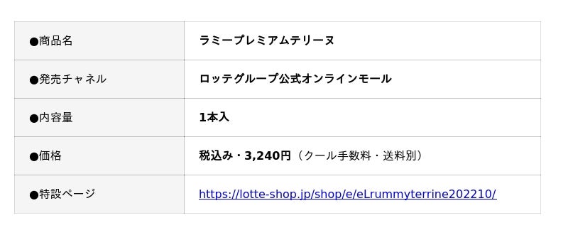 株式会社ロッテ(東京都新宿区、代表取締役社長執行役員:中島英樹、以下ロッテ)は、洋酒チョコレート市場売上売上No.1(※1)の「ラミー」発売60周年記念に、ファンの皆様へ感謝を込めた「ラミープレミアムテリーヌ」をロッテグループ公式オンラインモール限定で2025年10月7日(火)10時より発売いたします。本製品は、ラミーにも使用している特製ラムレーズンを従来品の2倍(※2)に増量し、テリーヌをよりみずみずしく、よりラムレーズンを楽しめるプレミアム品質に仕上げました。内容量は、約10%増量(※3)しながらも、お値段そのままを実現しました。一口食べれば、口いっぱいに広がる芳醇なラム酒の香りと、カカオの奥深い味わいが絶妙に重なり合います。また、華やかでプレミアム感のあるパッケージで、自分向けのご褒美としてはもちろん、バレンタインや母の日などのギフトとしてもおすすめです。大人がときめく味わいをぜひご堪能ください。※1 インテージ+ 洋酒チョコレート市場 2020年4月~2025年3月累計 ブランド別販売金額
