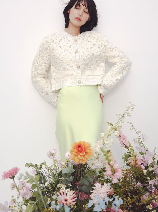 立体感のある刺繍と金ボタンが高級感をプラスしてくれるカーディガンにコンパクトに合わせたサテンスカート。バックスタイルにドレープができる切り替えになっていて、歩く姿も美しく見せてくれるアイテム。