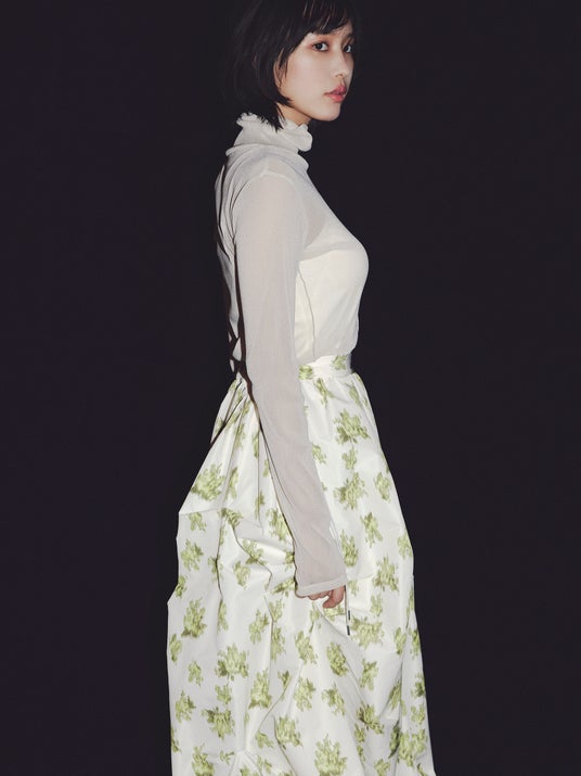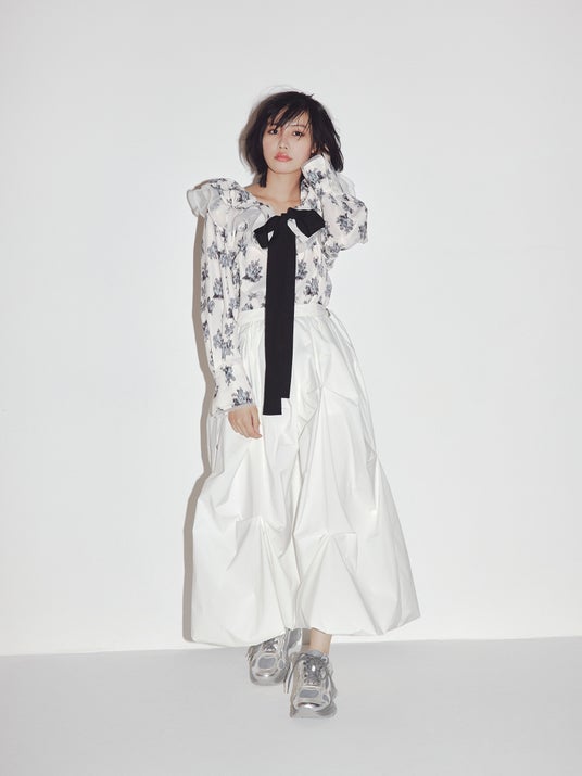 モードなぼかし柄のフラワーブラウスは襟元の立体的なフリルがフェミニン度を底上げ。襟は開き具合を調節でき、オフショルとしても着用できる2WAYデザイン。ホワイトルックでまとめたバルーンスカートはランダムにつまみタックを入れ立体感のあるデザインで春らしい軽やかな印象に。