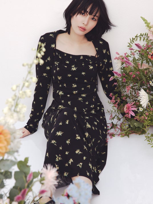 イエローの差し色が春らしいワンピースはFRAY I.Dオリジナルのフラワープリント。キャミソールワンピ―スに同素材の短丈ボレロがセットになっていて、それぞれ単品使いも可能で様々な着こなしが楽めるアイテム。