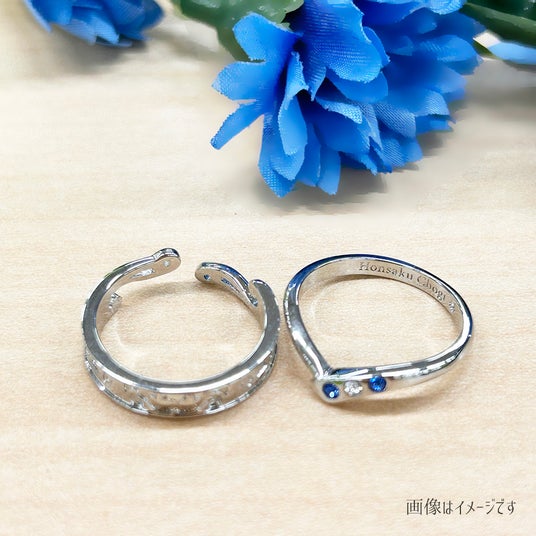 少し角度をつけてエレガントさを演出した、指をきれいに見せるV字リングの内側に刀剣名とモチーフアイコンを刻印しました。センター部分にはイメージカラーの小さなラインストーンを配置し、さりげなくも煌めきを感じられるデザインです。