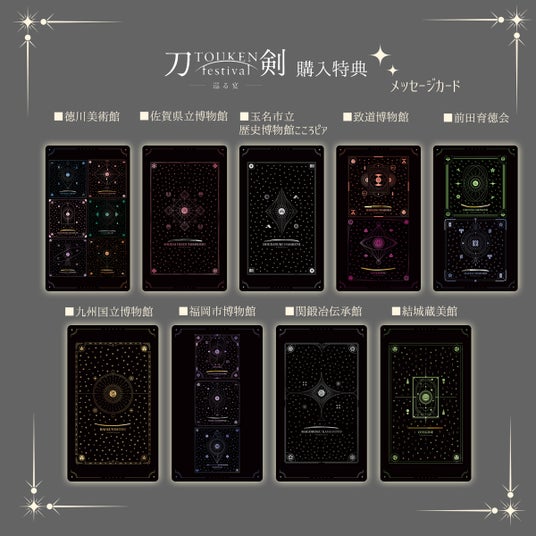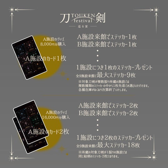 ■グッズを購入いただいた方へのプレゼント企画マルイウェブチャネルにて「刀剣festival-巡る宴-」グッズを各施設につき8,000円(税込)ご購入ごとに、各施設からのメッセージ入りの「刀剣カード」を1枚プレゼントいたします。