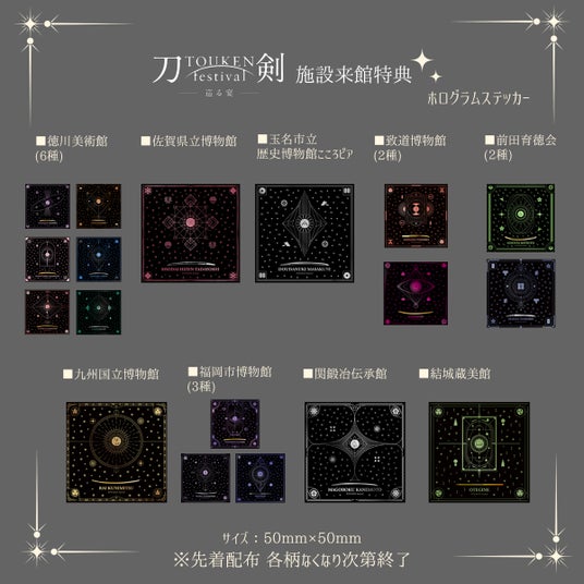 また、「刀剣カード」を本イベントにご賛同いただいた9施設にてご提示いただくと、その場でオリジナルホログラムステッカーをプレゼントいたします。