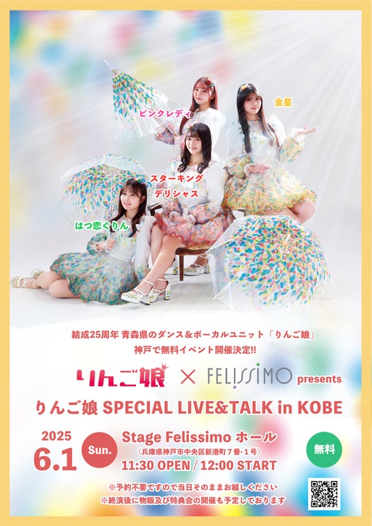 フェリシモが展開するフェリシモ「青森部」は、6月1日(日)12:00~『りんご娘×フェリシモpresents「りんご娘 SPECIAL LIVE&TALK in KOBE」』を開催します。より多くの神戸の方に、青森の魅力を知ってほしいとの思いから、無料イベントとして行います。開場は11:30~、先着で最大300名まで入場できます。ライブとトークが約60分、その後物販・特典会があります。フェリシモのユーモア雑貨ブランド「YOU+MORE!」と青森の魅力を発信するフェリシモ「青森部」が共同開発し、津軽びいどろの製造元・北洋硝子株式会社の監修によって完成した「青森の伝統工芸 津軽びいどろの風鈴傘」と、りんご娘の28thシングル『硝子のリンゴたち』のタイアップをきっかけに実現したイベントです。