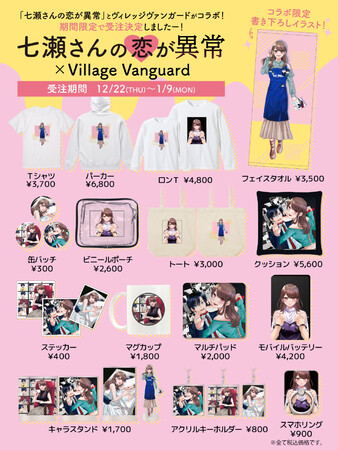 2022年12月22日(木)より、大人気YouTubeアニメ【七瀬さんの恋が異常】とヴィレッジヴァンガードのコラボグッズが発売決定!!実用性のあるグッズが盛りだくさん!デザインは今回のコラボグッズのために東雲とむ先生に描き下ろしていただきました!ファンなら絶対に欲しくなっちゃうラインナップばかり!2022年12月22日(木)~2023年1月9日(月・祝)までの期間限定完全受注販売となっておりますのでお買い逃がしにはご注意ください!今だけ限定のコラボグッズをお見逃しなく!