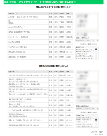 https://www.linebiz.com/jp/column/service-information/column/tableau/■「ブラックフライデー」で買いたいもの/買ったものについて一部紹介今年の「ブラックフライデー」で買い物をした/したいと思っている人に、何を買いたい/買ったかを聞きました。