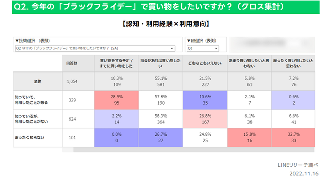 なお、認知・利用経験ごとに今年の「ブラックフライデー」における利用意向をクロス集計でみてみました。「ブラックフライデー」を「知っていて、利用したことがある」と回答した人の中で、「買い物をする予定/すでに買い物をした」と回答した人の割合は3割弱となり、「ブラックフライデー」の利用経験がない人に比べて高くなりました。