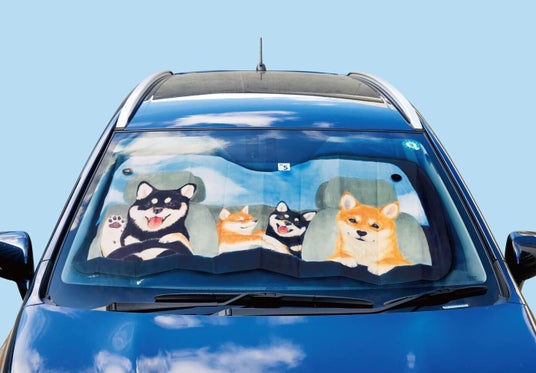 柴犬ファミリーがドライブ気分で飼い主の帰りを待つ姿にキュンとするサンシェードです。