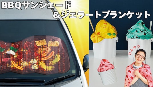 フェリシモが展開するユーモア雑貨ブランド「YOU+MORE!」は、食欲をそそるグルメなモチーフをリアルプリントで再現した便利で楽しい暑さ対策グッズのウェブ販売を3月25日より開始しています。思わず二度見するインパクトの「BBQサンシェード」と、心までひんやりとろける「ジェラートみたいなひんやりブランケット」の2点です。「こんなに車内が熱いなら、いっそフロントガラスでBBQができるのでは?」という逆転の発想から生まれました。灼熱の駐車場をまたたく間に香ばしいBBQ会場へと変え、気分が下がる真夏のドライブを笑いとともに盛り上げます。アイスを目の前ですくってもらうときのワクワク感を閉じ込めたジェラートブランケットは、両面接触冷感素材を採用し、ふれた瞬間に「にんまり」と笑顔になれる心地よさを届けます。暑さが厳しい季節を「おいしさ」で楽しく乗り越えられる、愛嬌たっぷりな“夏のごちそうセット”です。日常のふとした瞬間に、涼しさと笑顔を届けます。