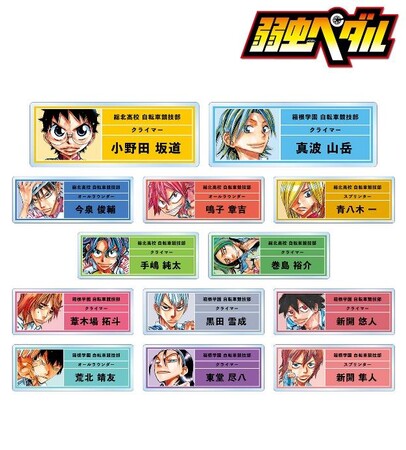 小野田 坂道、今泉 俊輔、鳴子 章吉、青八木 一、手嶋 純太、巻島 裕介、真波 山岳、葦木場 拓斗、黒田 雪成、新開 悠人、荒北 靖友、東堂 尽八、新開 隼人を名前や脚質タイプと合わせてデザインしました。