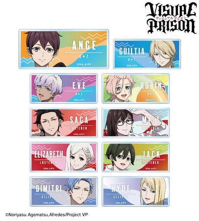 アニメイトで開催された「ヴィジュアルプリズン」アニメイトフェア描き下ろしイラストの結希アンジュ、ギルティア・ブリオン、イヴ・ルイーズ、ロビン・ラフィット、サガ・ラトゥール、ミスト・フレーヴ、ヴーヴ・エリザべス、ジャック・ムートン、ディミトリ・ロマネ、ハイド・ジャイエをメインにデザインしました。