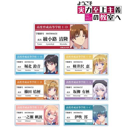 種類 :全10種(綾小路清隆、堀北鈴音、軽井沢恵、櫛󠄁田桔梗、坂柳有栖、一之瀬帆波、龍園翔、伊吹澪、佐藤麻耶、茶柱佐枝)