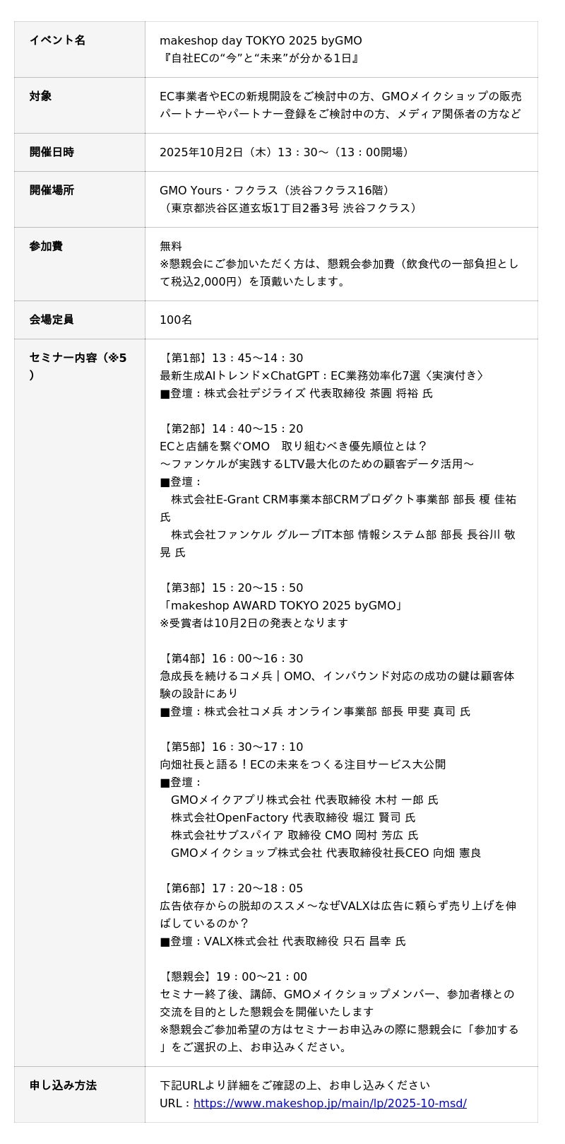 GMOインターネットグループのGMOメイクショップ株式会社(代表取締役社長CEO:向畑 憲良、以下、GMOメイクショップ)は、ECサイト運営担当者などを対象としたイベント「makeshop day TOKYO 2025 byGMO」を、2025年10月2日(木)にGMO Yours・フクラス(東京都渋谷区)にて開催します。