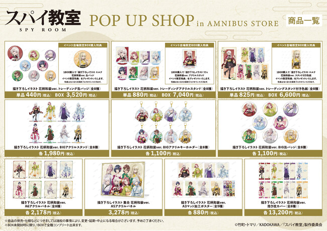 今回のイベントでは、TVアニメ「スパイ教室」より新規描き下ろしイラストを使用したグッズを多数先行販売する他、AMNIBUS STORE限定購入特典の配布を予定しております。