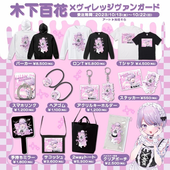 2023年10月13日(金)より、【木下百花】とヴィレッジヴァンガードの限定コラボグッズがオンラインストアで発売決定!グッズデザインはイラストレーター【知花そら】による描き下ろし!ここでしか手に入らない特別なグッズたちは、オンラインストア限定の完全受注販売となります!!受注期間は2023年10月13日(金)~2023年10月22日(日)の10日間となりますので、この機会を絶対に絶対にお見逃しなく!
