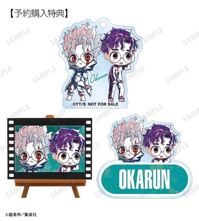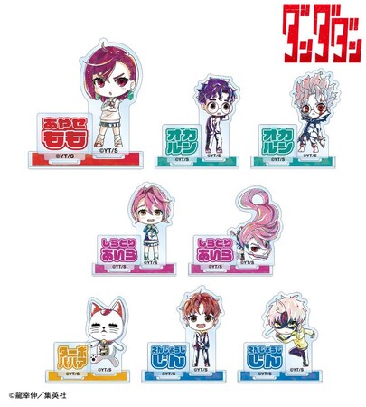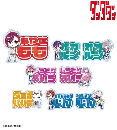 綾瀬 桃、オカルン、オカルン(変身)、白鳥 愛羅、白鳥 愛羅(変身)、ターボババア、円城寺 仁、円城寺 仁(変身)のデフォルメイラストを新たなタッチで魅力的に表現し、パーツ付きのアクリルスタンドに仕上げました。