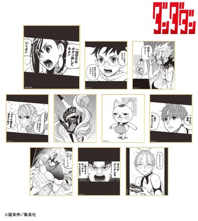 綾瀬 桃、オカルン、オカルン(変身)、白鳥 愛羅、白鳥 愛羅(変身)、ターボババア、円城寺 仁、円城寺 仁(変身)、坂田 金太、バモラのコマイラストをミニ色紙に仕上げました。