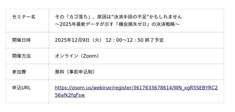 本調査の結果をもとに、ECサイトのカゴ落ち対策や運用最適化のヒントを解説するオンラインセミナーを開催します。当日は、調査から見えた消費者インサイトの解説に加え、ホワイトペーパーには掲載しきれなかった物販・サービスEC等ごとの「年代別」「商材別」といった詳細データも公開予定です。また、「確定していたはずの売上」の機会損失を防ぎ、売上を最大化するための「攻め」の決済戦略を具体的に紹介します。