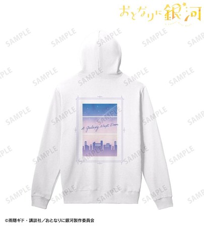 漫画の原稿用紙デザインの中に、作品をイメージした宇宙柄を閉じ込め、五色しおりをイメージとした流れ星のあしらいと英字のタイトルのデザインをパーカーに仕上げました。