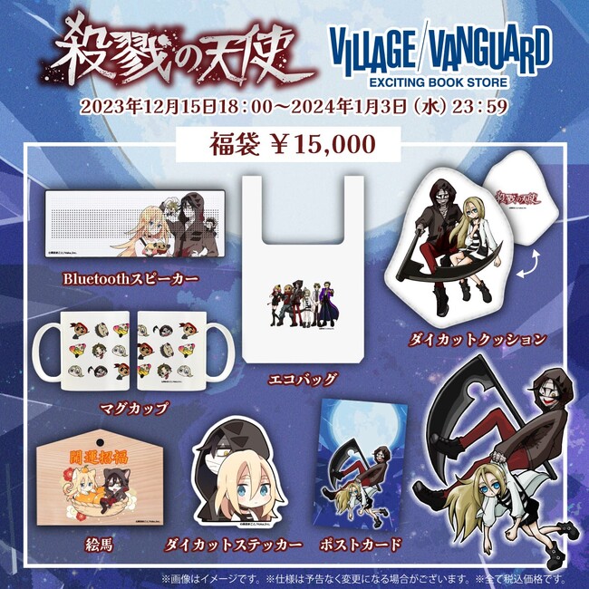 2023年12月15日(金)より、【殺戮の天使】のヴィレッジヴァンガード限定福袋がオンラインストアにて発売決定!!Bluetoothスピーカーやクッションなど、豪華アイテムが盛りだくさん!ファン必見のアイテムとなっております!2023年12月15日(金)~2024年1月3日(水)の期間限定オンライン受注販売のため、この機会をお見逃しなく!
