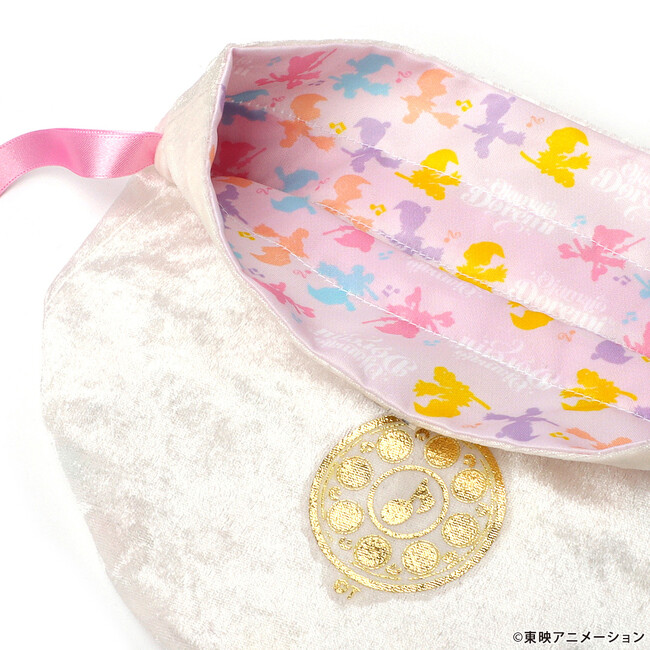 丸底の巾着型で容量もたっぷり!裏地はおジャ魔女たちのシルエットの総柄でにぎやかに♪