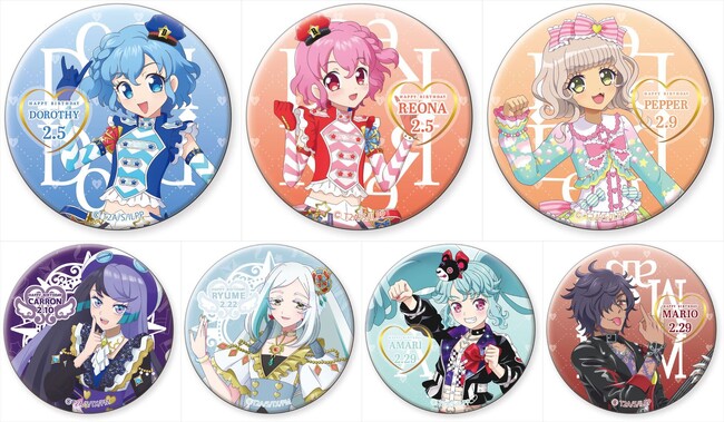 ー商品情報ー ≪ハピプリバースデー202402≫ハピプリバースデー202402 缶バッジ(ドロシー/レオナ/ペッパー/きゃろん/リューメ/あまり/マリオ)各715円(税込)