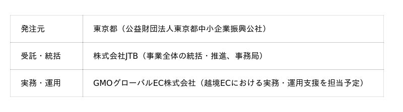 本事業では、公社からの委託を受けて事業推進全体を担う株式会社JTBと連携し、GMOグローバルECが海外ECモールへの出店支援から販売運用、データ分析、プロモーション施策の実行まで、越境ECにおける実務・運用領域を一体的に担うことで、東京都内中小企業の海外販路開拓を支援します。