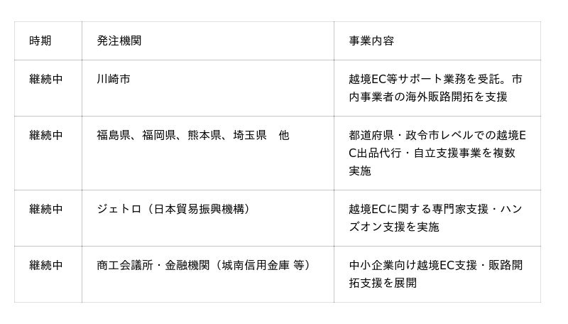 【自治体・支援機関との越境EC支援実績】 GMOグローバルEC(旧ジェイグラブ)は2010年の創業以来、自治体・官公庁・支援機関と連携した越境EC事業を継続的に展開しています。累計支援実績は3,000社(※3)にのぼり、越境EC業界トップクラスの実績を誇ります。直近では川崎市の「令和8年度越境EC等サポート業務委託に関する公募型プロポーザル」において受託者として選定されました。