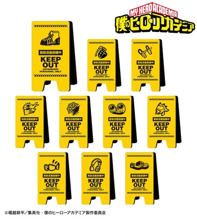 緑谷出久、爆豪勝己、麗日お茶子、飯田天哉、轟焦凍、蛙吹梅雨、切島鋭児郎、上鳴電気、耳郎響香、イレイザーヘッドのモチーフを立て看板風のアクリルメモスタンドに仕上げました。
