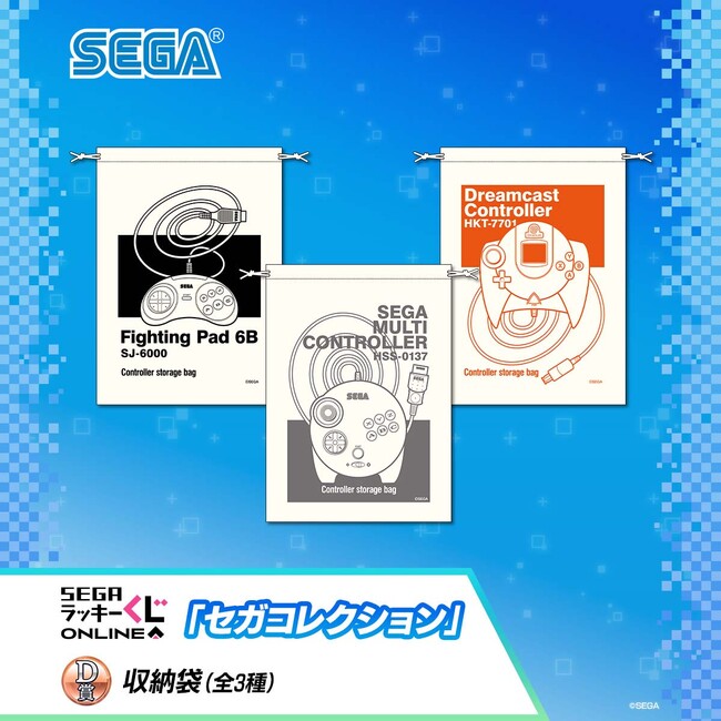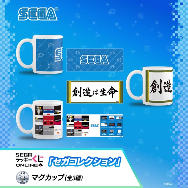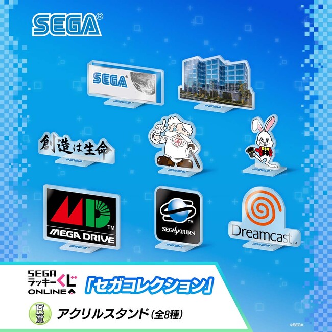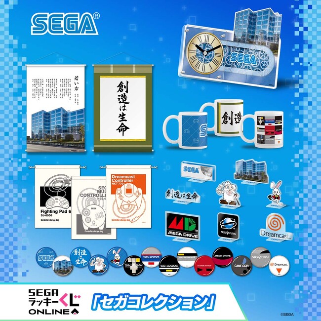 セガ ラッキーくじオンライン「セガコレクション」では、羽田・大鳥居にあったセガ旧本社ビルの、在りし日の姿が楽しめる「アクリル時計」や、セガのかつての社歌や社是“創造は生命”を自宅でも眺められる「タペストリー」、セガのロゴをプリントした「マグカップ」、歴代ハードのコントローラーも保管できる「収納袋」、ゲームの説明書に登場するアソビン教授やゲームズ博士の「アクリルスタンド」や「缶バッジ」などのアイテムを多数ご用意いたしました。