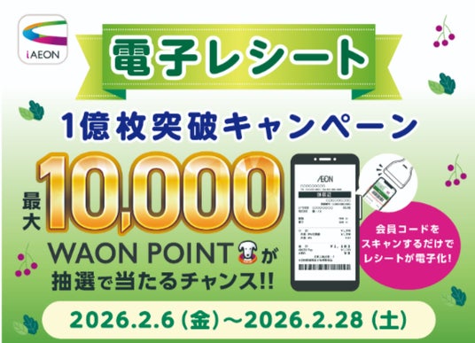 イオンが提供するトータルアプリ「iAEON」の電子レシートの利用が、2026年1月末で累計1億枚を突破しました。2024年6月のサービス開始から1年8カ月での1億枚達成となります。