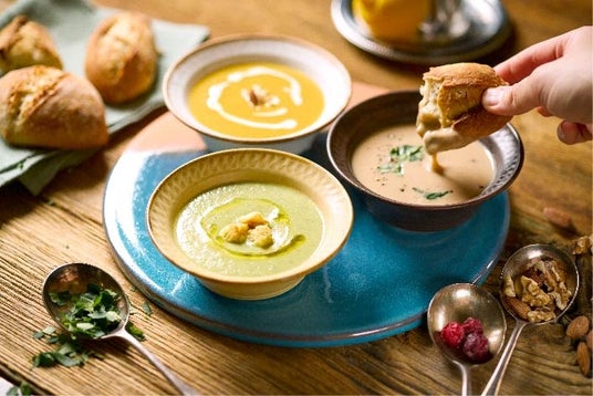 スープを使ったアレンジ。電子レンジや鍋で手軽に温めるだけで、簡単に温かいスープを楽しめます。